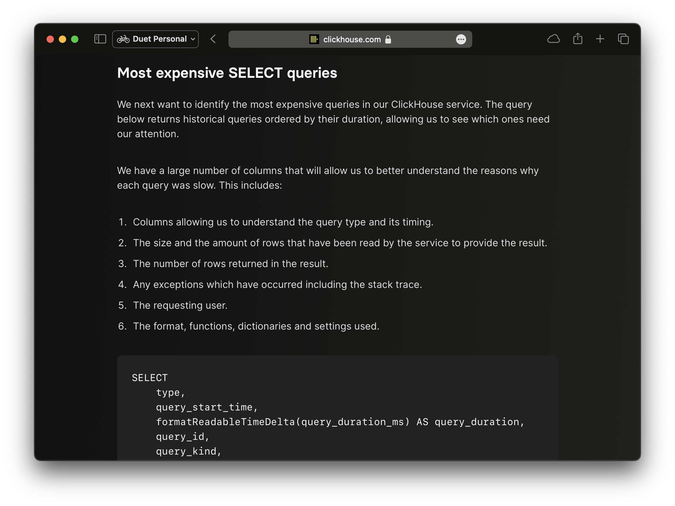 You should read these blog post by ClickHouse about rely on the system tables to get more insights about running queries and their performance. These contains about some topic like for example: most expensive SELECT queries, average query duration and number of requests, number of SQL queries by client or user, etc.