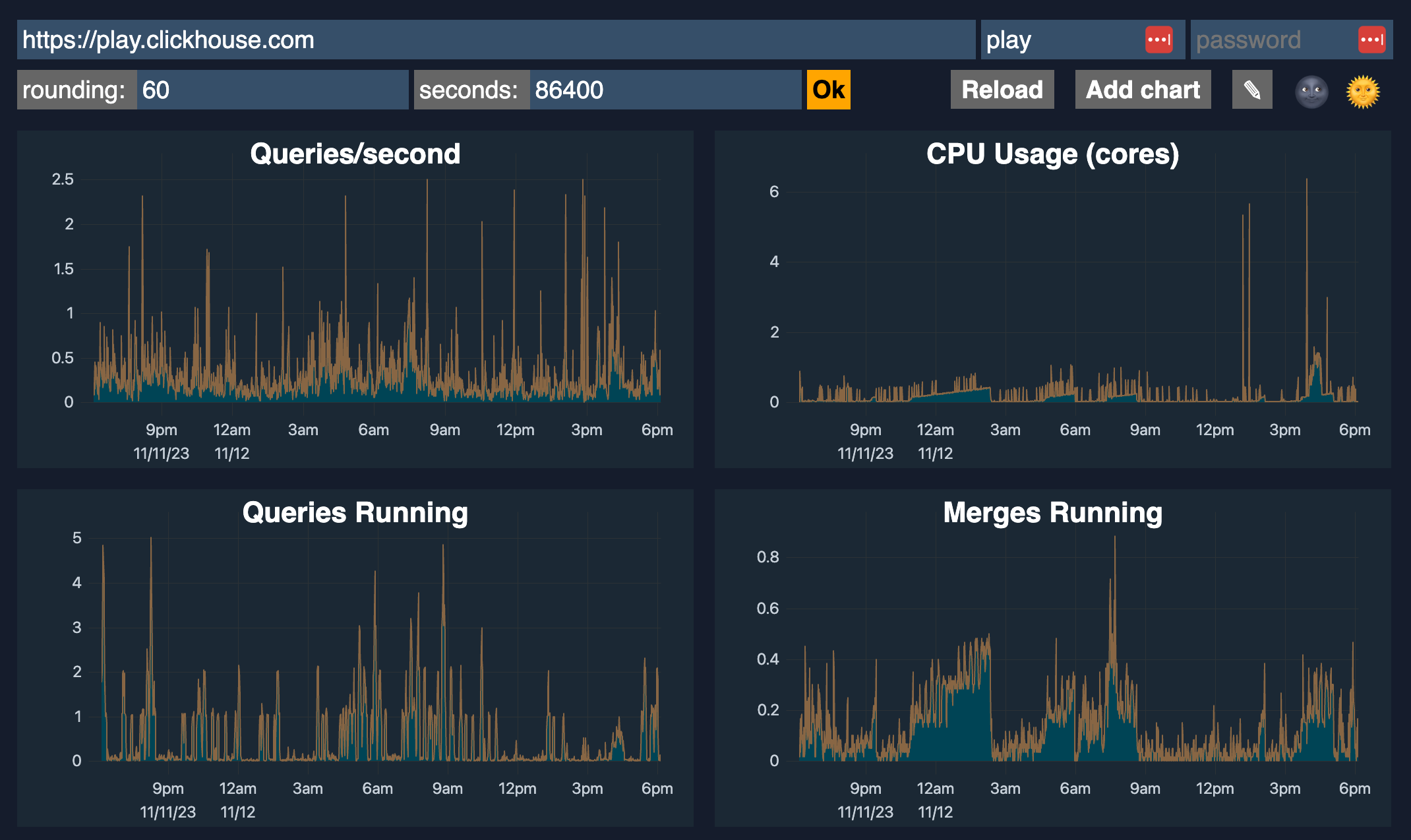 ClickHouse includes an advanced observability dashboard feature accessible at $HOST:$PORT/dashboard (login required).